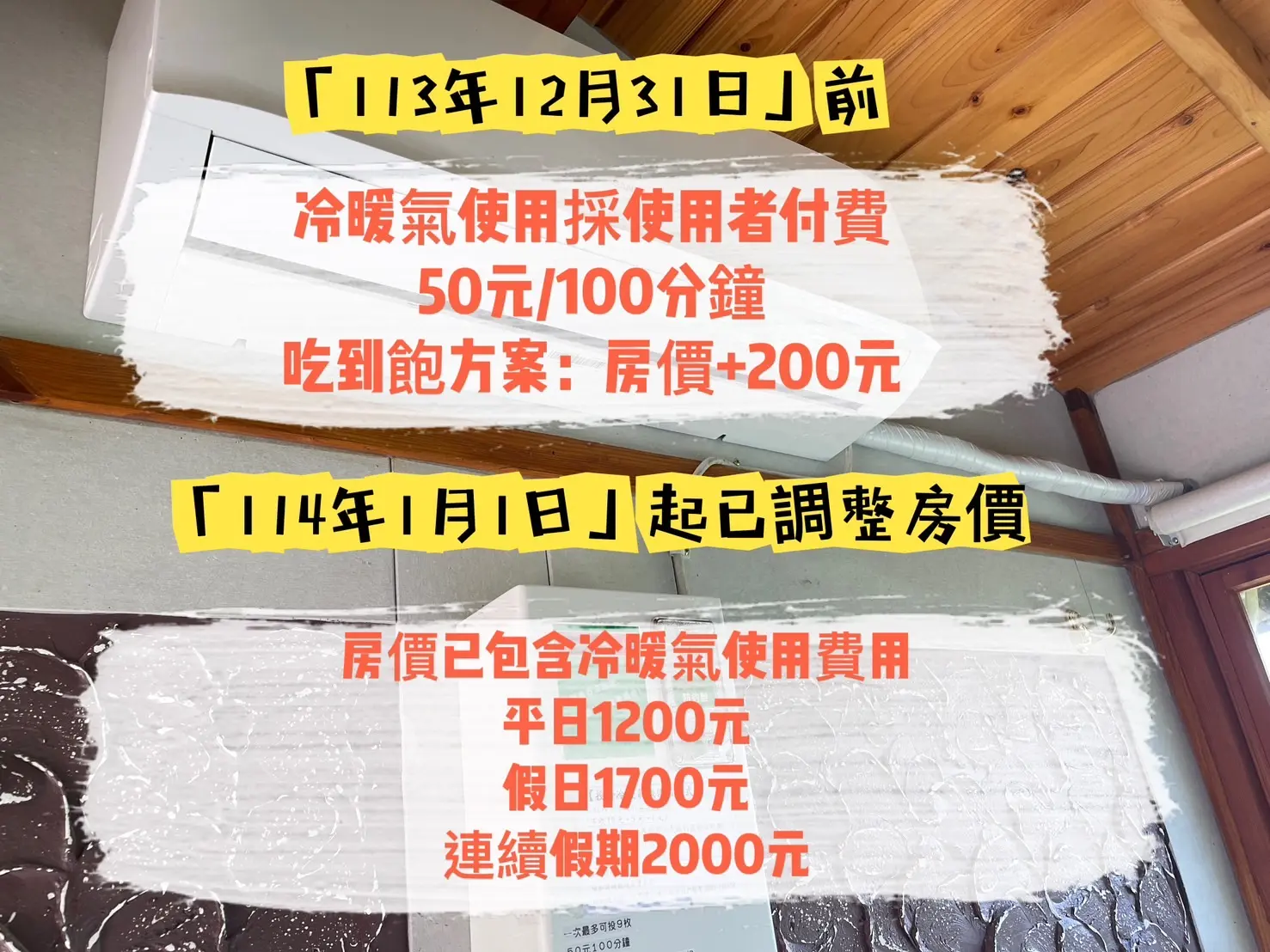 - 1 間 ( 4 人以下) 費用:平日:1200 元 假日:1700 元 連續假日:2000 元【連續假期限接三天兩夜或以上之預訂】